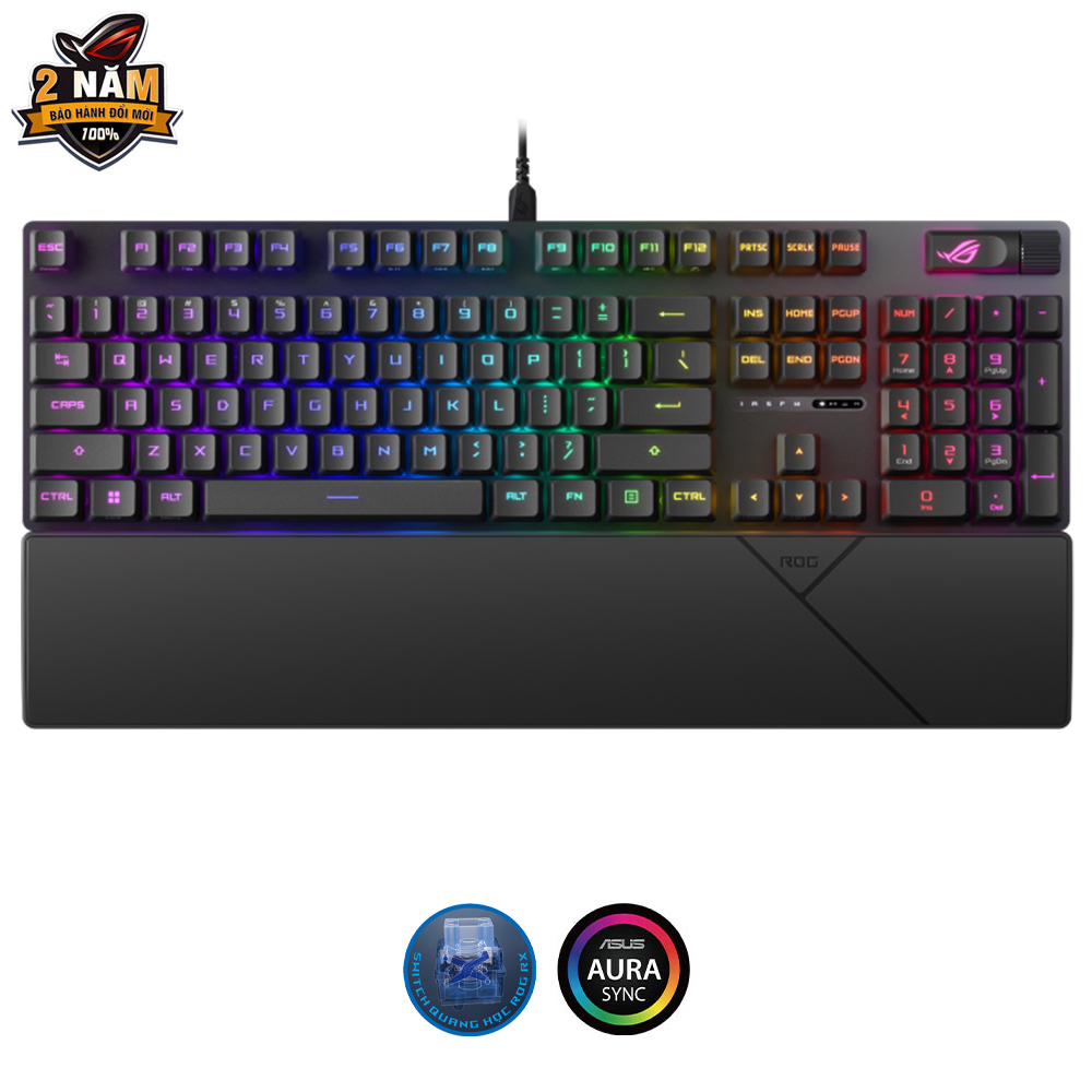Keycap ABS với lớp phủ chống tia UV mang lại cảm giác cao cấp và khả năng chống bóng cao. Nút Space được thiết kế độc đáo theo chủ đề ROG cùng 3 đèn LED RGB mặt dưới