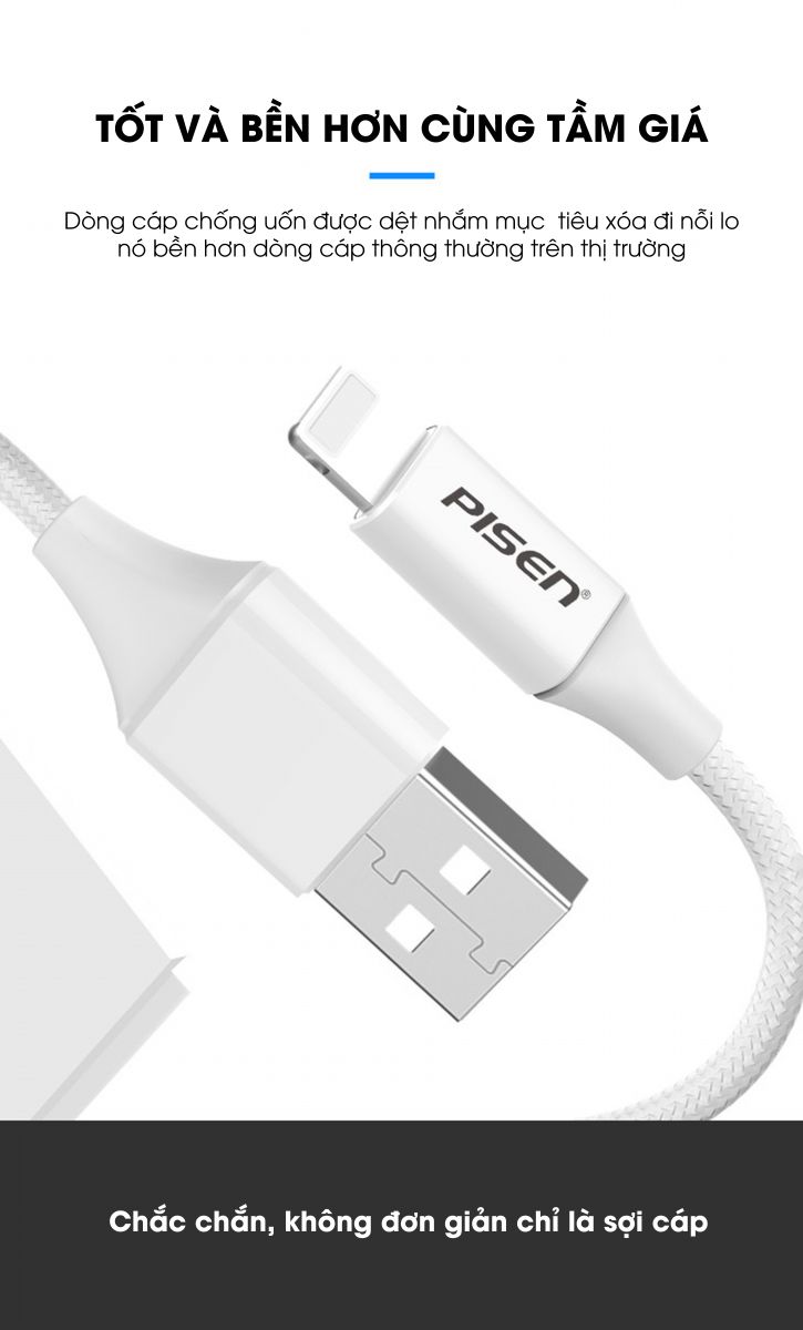 CÁP USB-A TO LIGHTNING PISEN ANTI FRACTURE AL17-1800 (màu trắng,1m8, 2.4A)