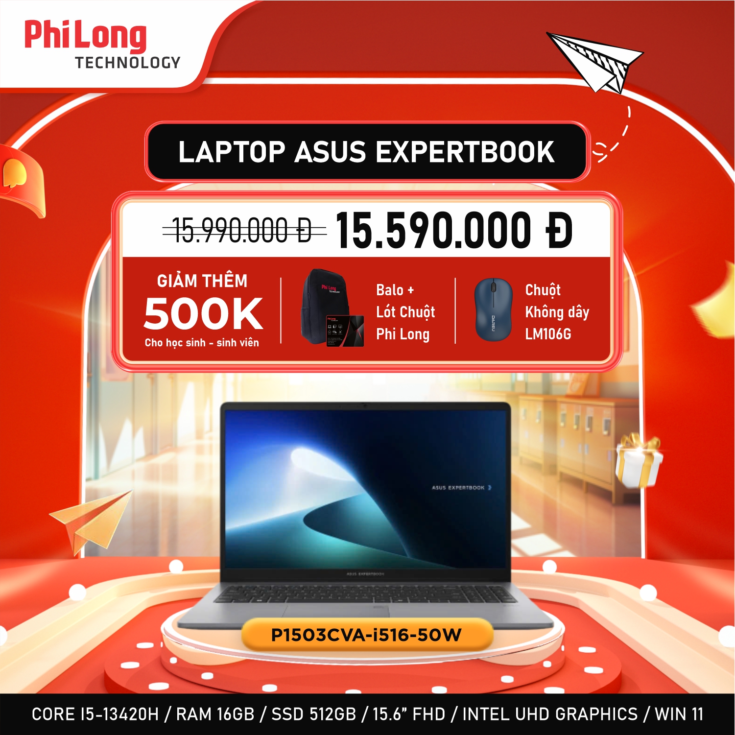 Laptop ASUS ExpertBook P1503CVA-i516-50W (Intel Core i5-13420H, RAM 16GB, SSD 512GB, Intel UHD Graphics, Màn Hình 15.6 inch FHD, Windows 11)