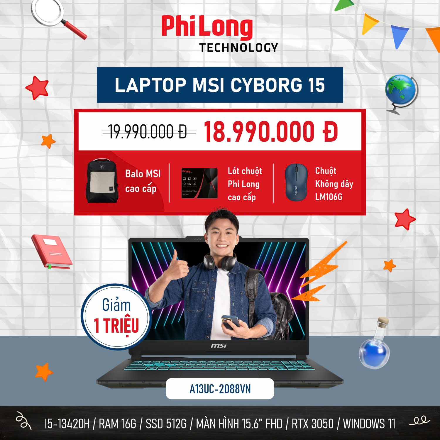 Laptop MSI Cyborg 15 A13UC 2088VN (Intel Core i5-13420H, RAM 16GB DDR5, SSD 512GB, RTX 3050 4GB, Màn Hình 15.6inch FullHD 144Hz, Windows 11, Màu Đen)