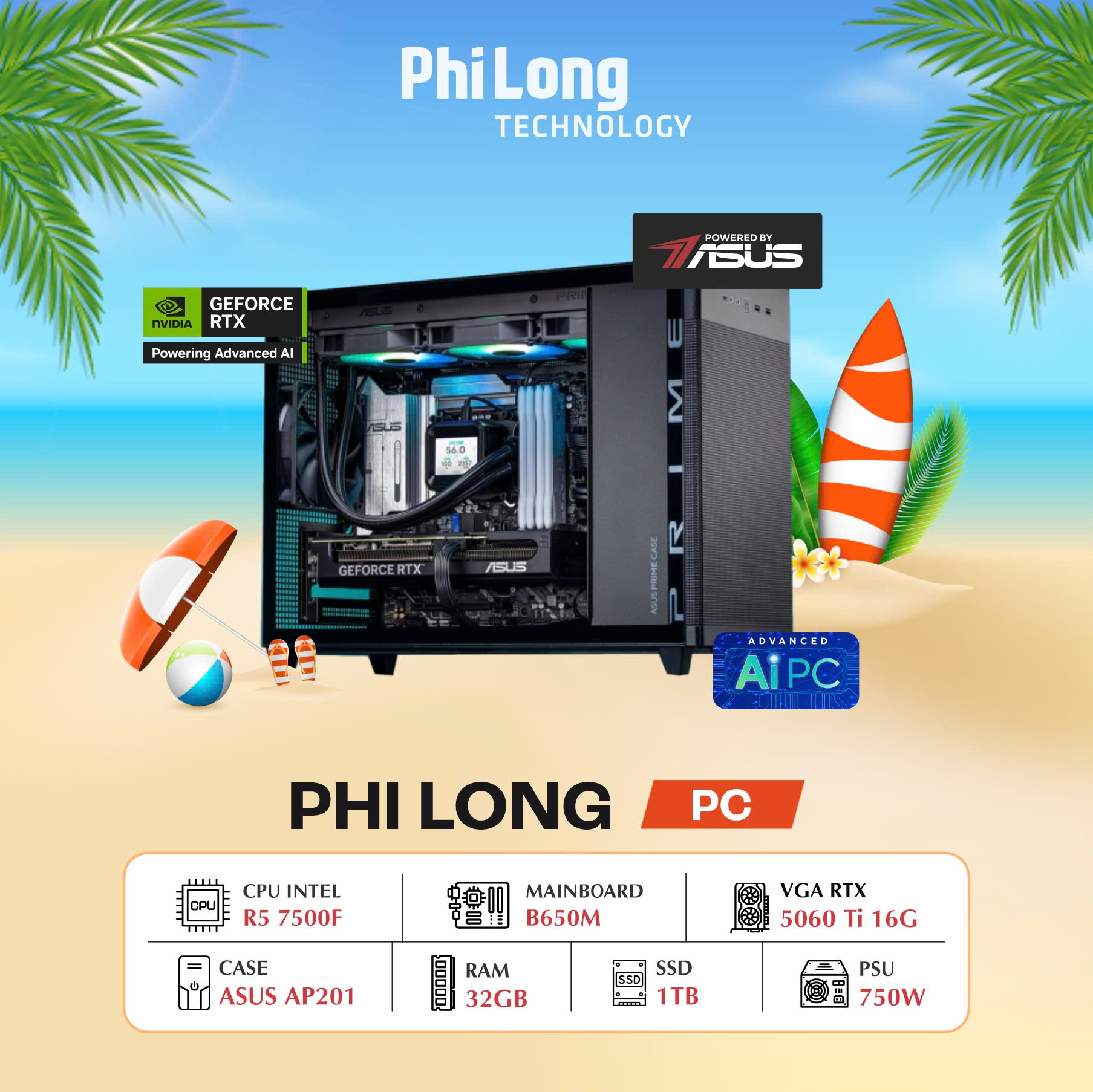 PC Phi Long AAA Gaming – R5 7500F / RTX 5060 Ti 16G / RAM 32GB / SSD 1TB / PSU 750W – Powered By ASUS