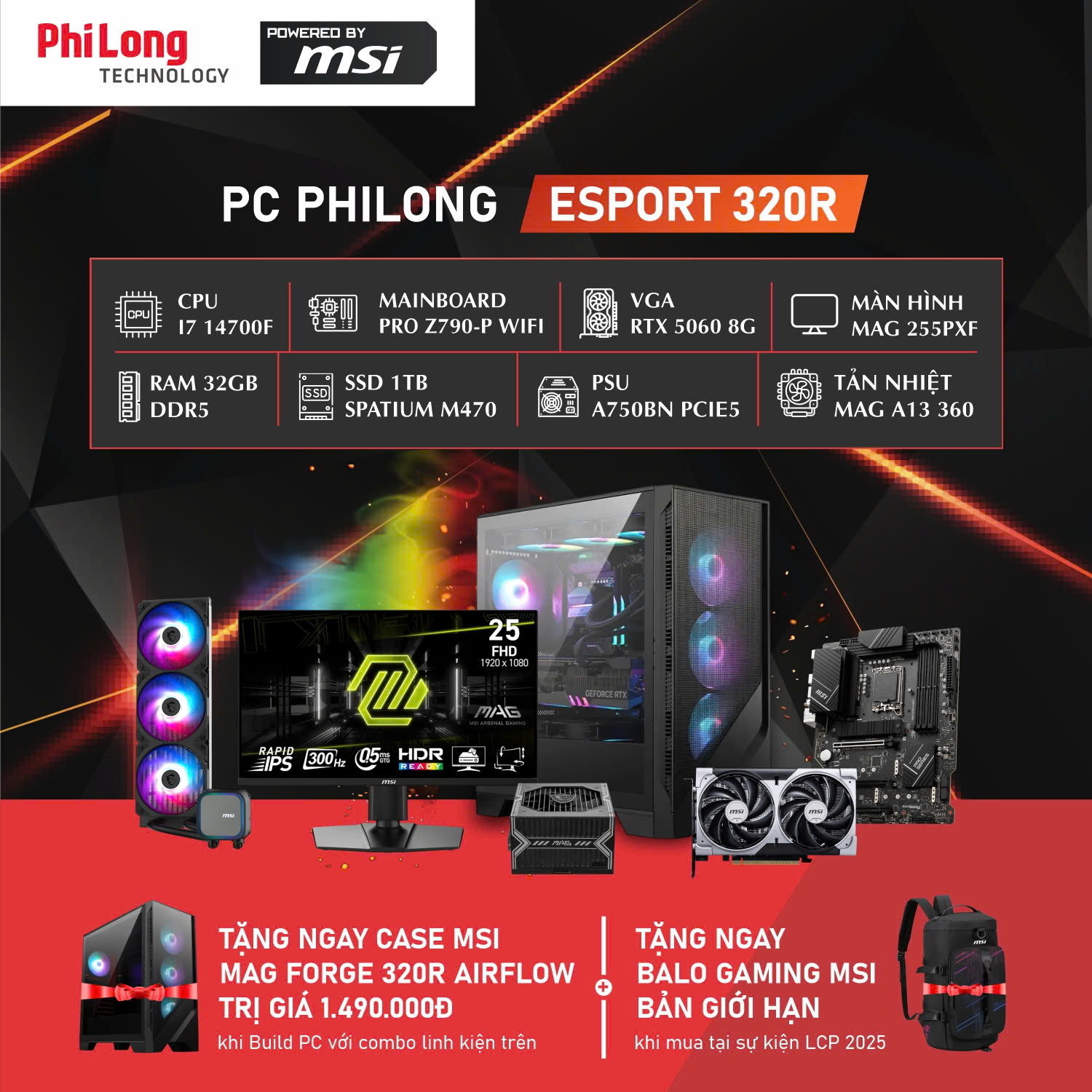 PC Phi Long Gaming Esport 320R – i7 14700F / RTX 5060 8GB / RAM 32GB / SSD 1TB / Tản A13 360 / Màn 25 inch 300Hz – Powered By MSI