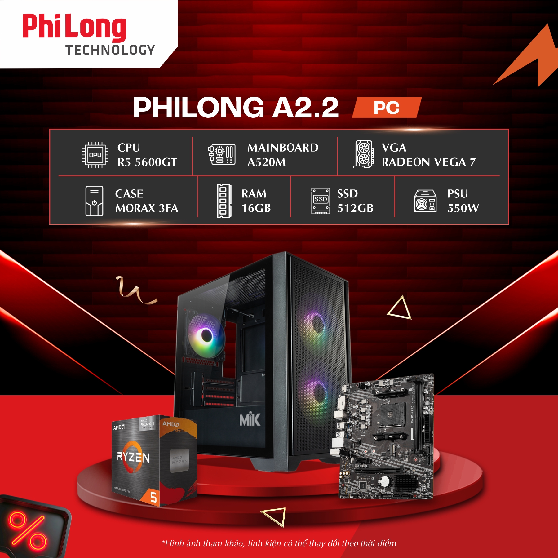 PC Phi Long Office A2.2 (Ryzen 5 5600GT, A520M, RAM 16GB, SSD 512GB, PSU 550W, WiFi)